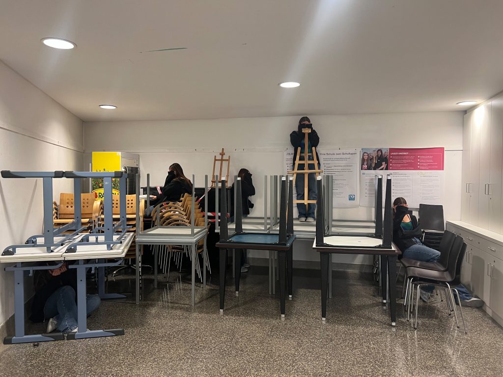 Bei dieser Aufgabe mussten wir irgendwo im Schulhaus 5 Bilder machen. Wir haben hierfür den Vorraum von dem Festsaal genommen. Diese 5 einzelnen Bilder haben wir dann bei Photoshop so bearbeitet das ich mich mit Hilfe von Ebenen aus jedem Bild ausgeschnitten habe und diese dann alle auf ein Bild drauf gegeben habe.