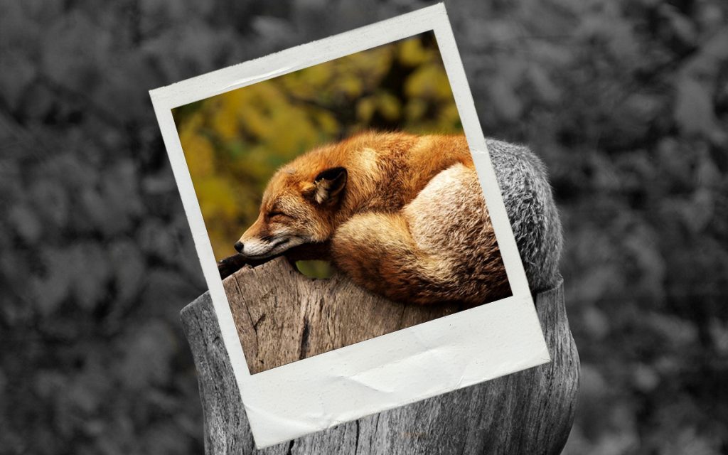 Bei der Aufgabe Polaroid haben wir den Hintergrund also dort wo der Fuchs Höchs Teils nicht ist, Schwarz weiß gemacht und dann haben wir den Rahmen eingefügt und konnten danach mit Hilfe von ebenen Masken das innere des Rahmen wieder bunt machen